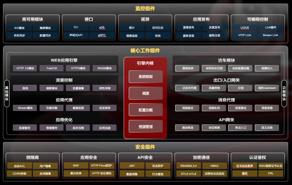 OpenNJet應用引擎是面向互聯網和云原生應用提供的運行時組態服務程序。具備環境感知、安全控制、加速優化等能力,可利用動態加載機制實現不同的產品形態,如API網關、消息代理、入口/出口控制器、邊車、負載均衡和WAF等。
