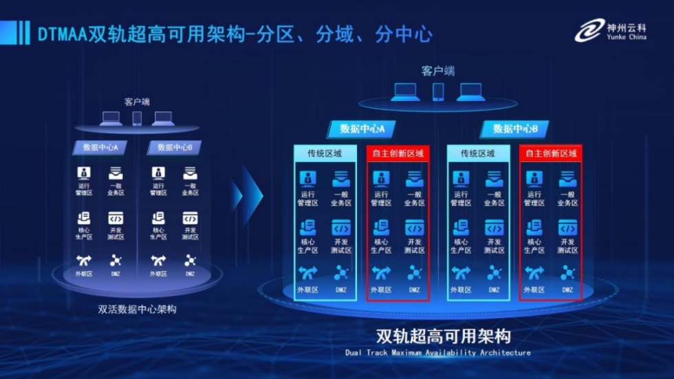 為幫助金融客戶更好地應(yīng)對(duì)數(shù)字經(jīng)濟(jì)時(shí)代對(duì)可持續(xù)性的高要求,實(shí)現(xiàn)“信創(chuàng)”與“數(shù)字化”齊頭并進(jìn),k8凱發(fā)推出了雙軌超高可用架構(gòu)。該架構(gòu)在雙活數(shù)據(jù)中心的分區(qū)調(diào)度基礎(chǔ)上,增加信創(chuàng)域和非信創(chuàng)域的分域調(diào)度,實(shí)行信創(chuàng)域與傳統(tǒng)域應(yīng)用全量部署,使雙中心運(yùn)營變?yōu)殡p中心四區(qū)域并行運(yùn)行,互為多活,將“0到1”的單軌建設(shè)道路變?yōu)榉謪^(qū)分域協(xié)同的多活雙軌超高可用架構(gòu)。幫助客戶在新架構(gòu)下,保障“信創(chuàng)”的同時(shí)解決性能瓶頸,提升穩(wěn)定性,保證應(yīng)用可持續(xù)性,最終實(shí)現(xiàn)信創(chuàng)區(qū)域和非信創(chuàng)區(qū)域的平滑過渡,完成國產(chǎn)化替代目標(biāo)。
